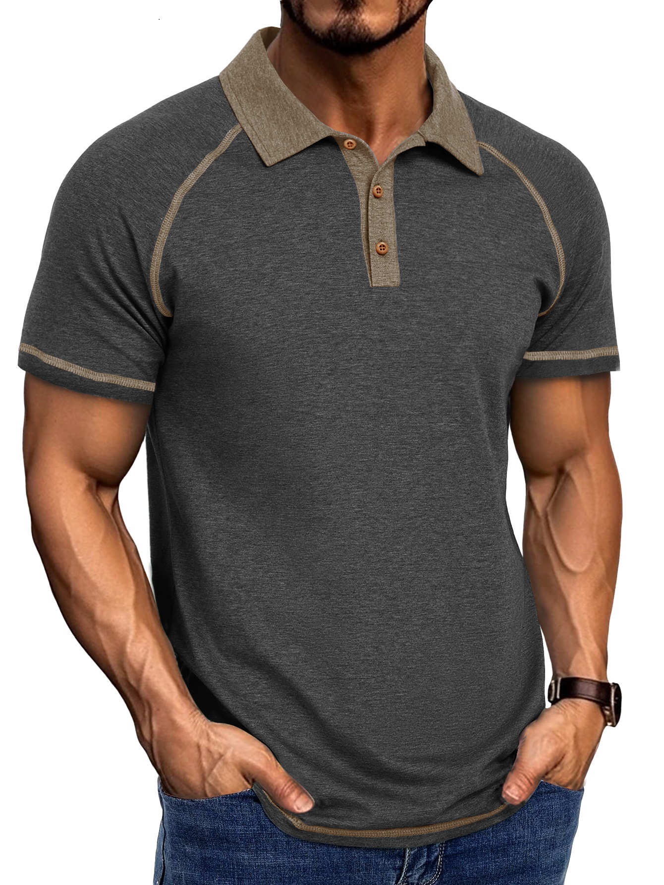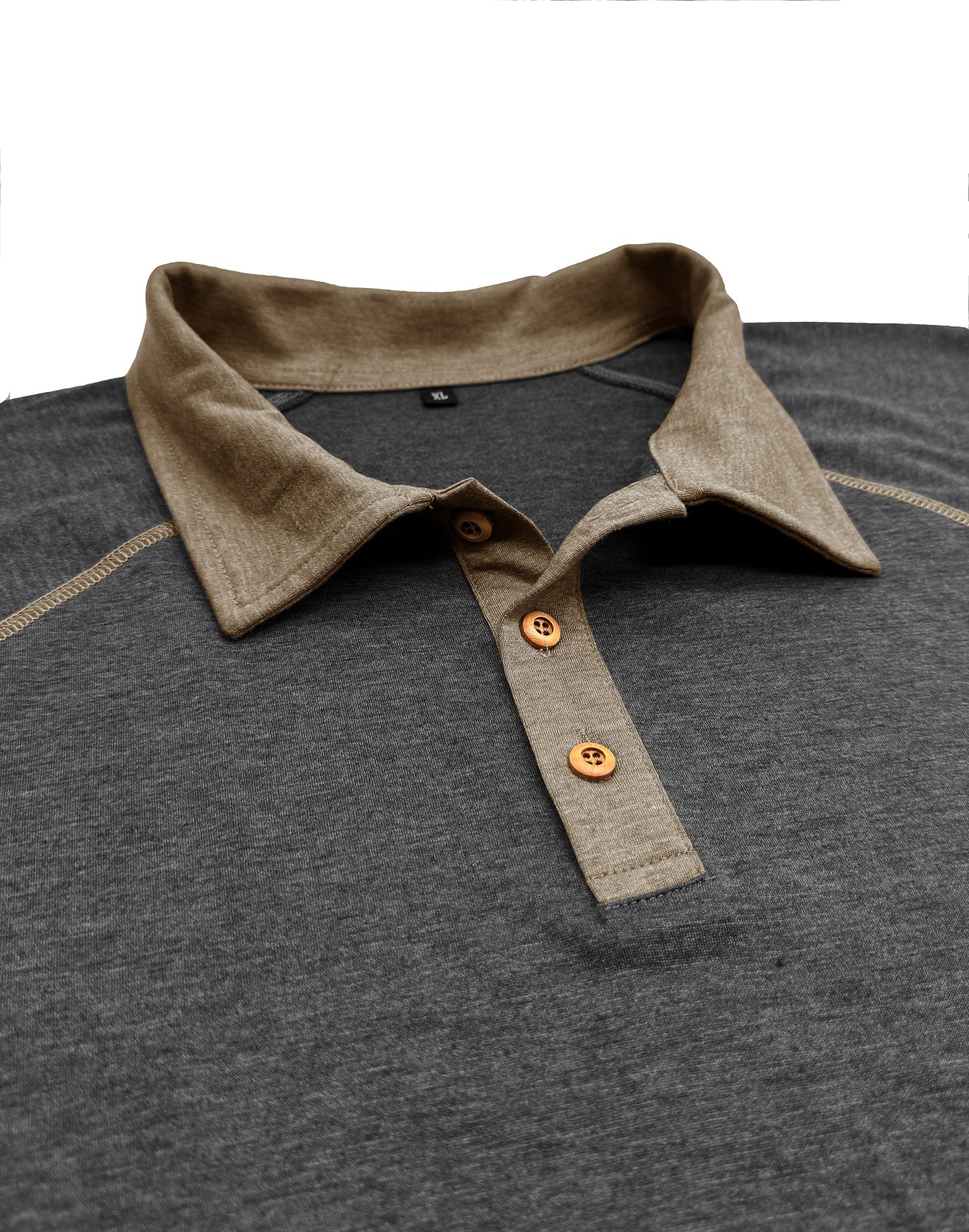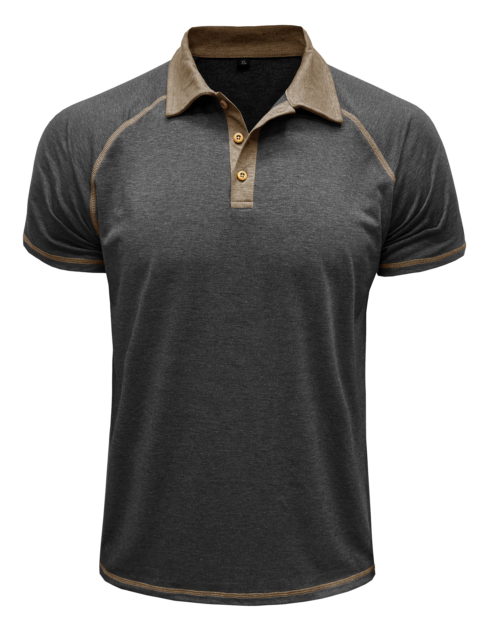 Design:Men's raglan polo shirts features with polo collar, 3 button closure, subtle contrast stitching throughout, faux wood buttons, the contrasts will wake up denim and khakis.