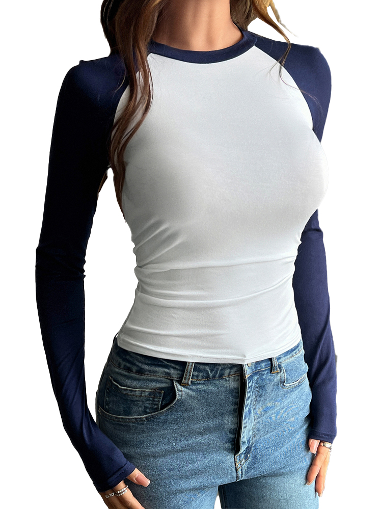 Women's Long Sleeve Shirts Slim Fit Stretchy Color Block Slightly Cropped Tops