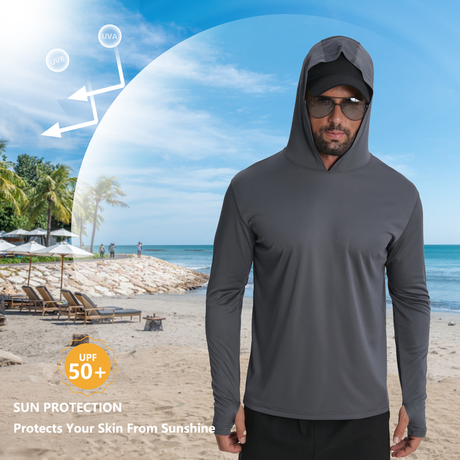 Fishing Hoodies: Mens long sleeve fishing sun shirts with a hoodie helps protect your neck from sun burn,The thumb hole fix the sleeves better and provide more sun protection