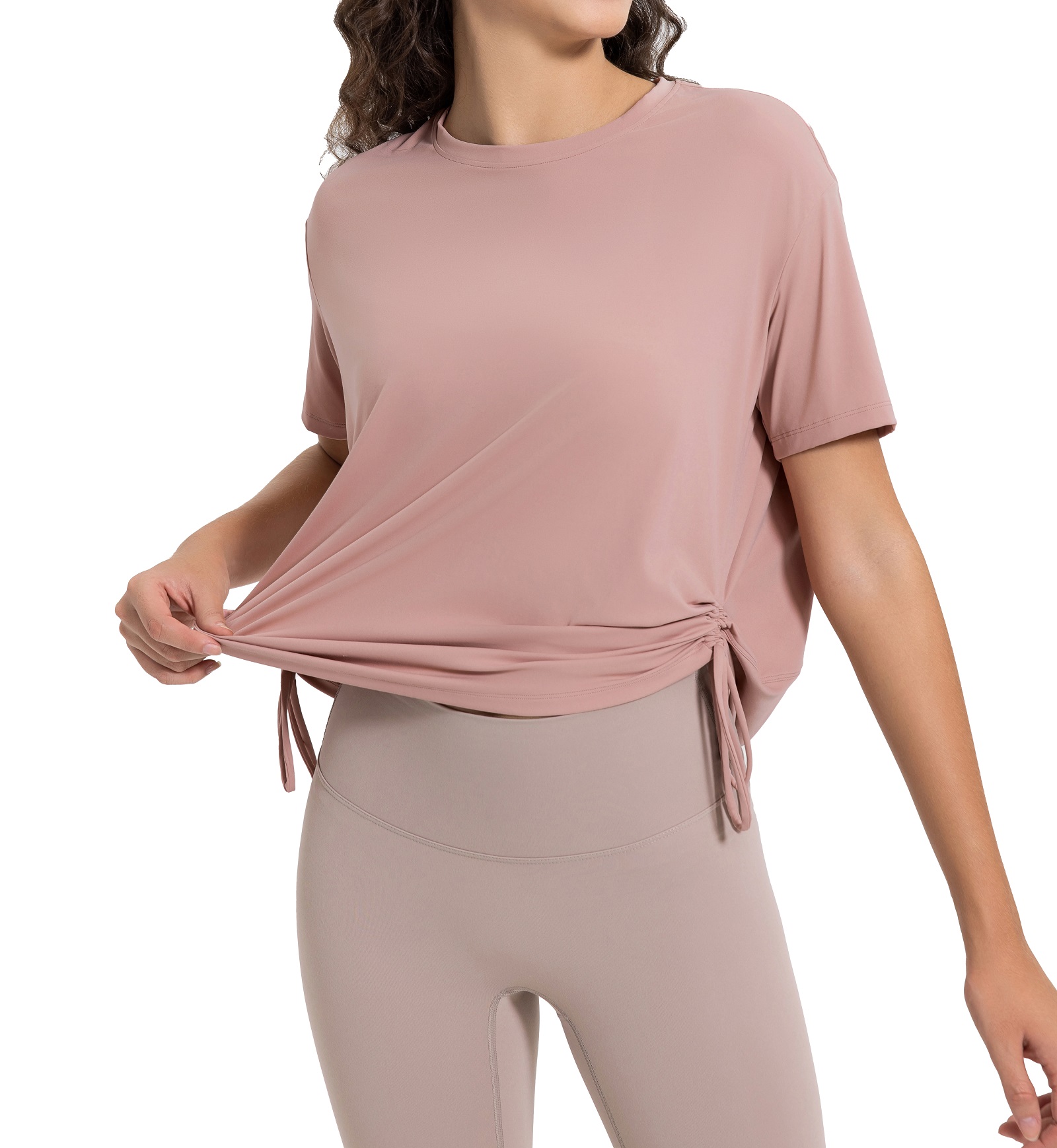 Women's Summer Casual Side Gathers Round Neck Fitness Yoga Moisture-Wicking Short Sleeve Top