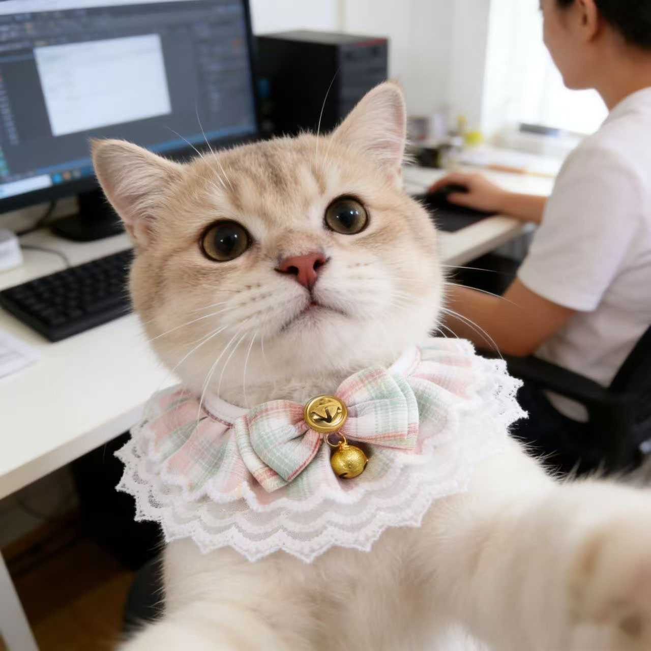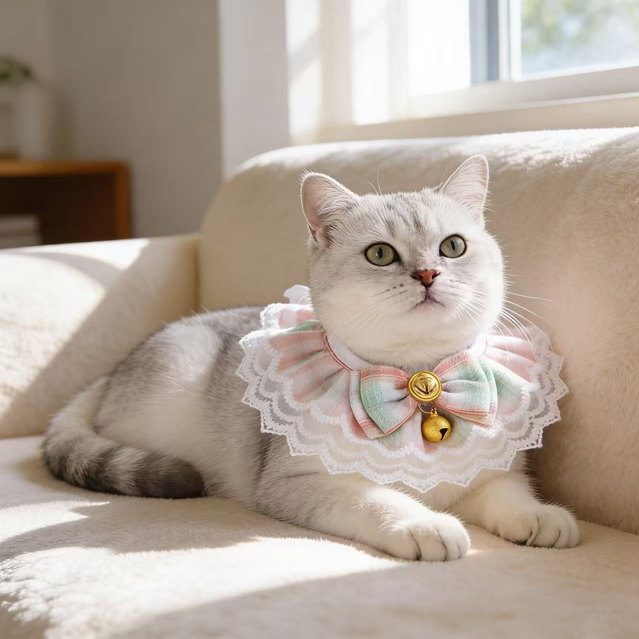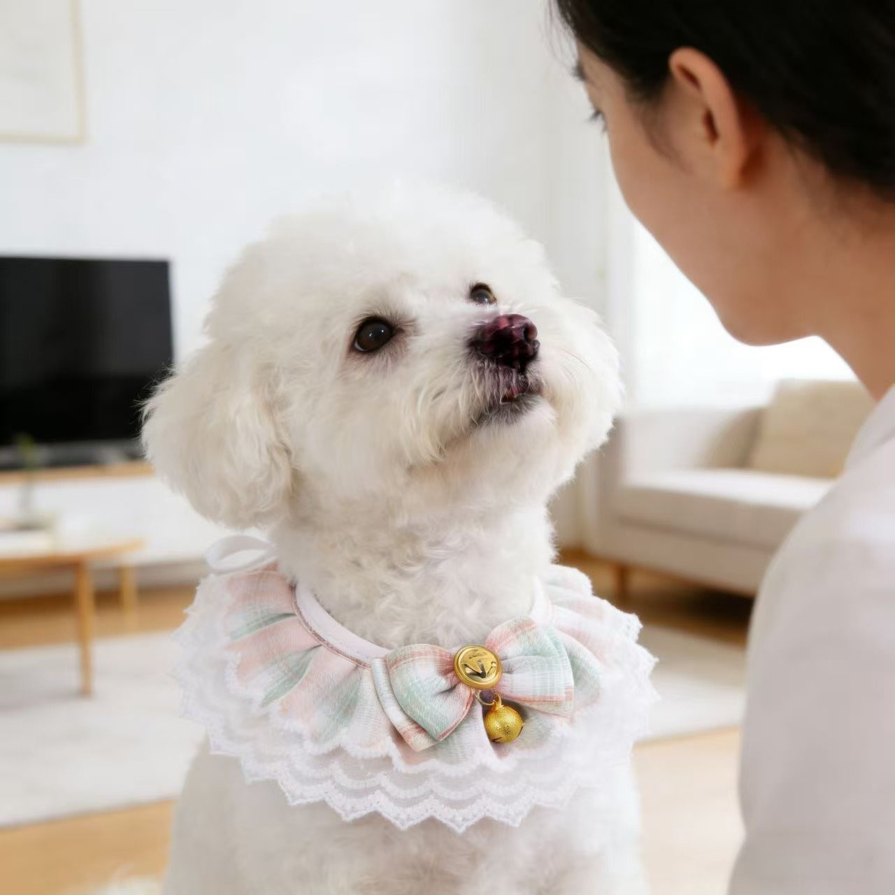 Exquisite Design: This pet bandana features a beautiful lace edge and a charming bow with a bell, adding a touch of elegance and cuteness to your furry friend's look. The delicate lace pattern and soft fabric make it comfortable for your pet to wear all day long.