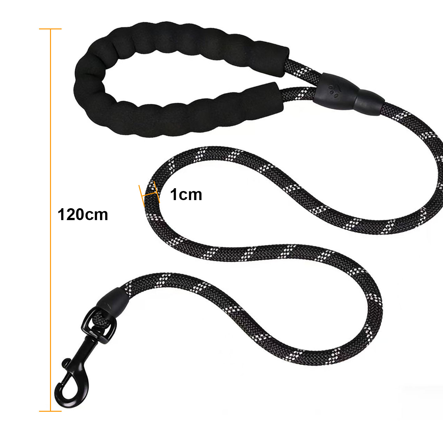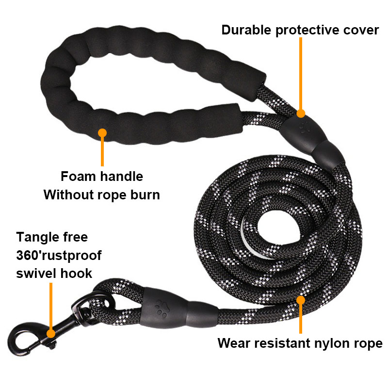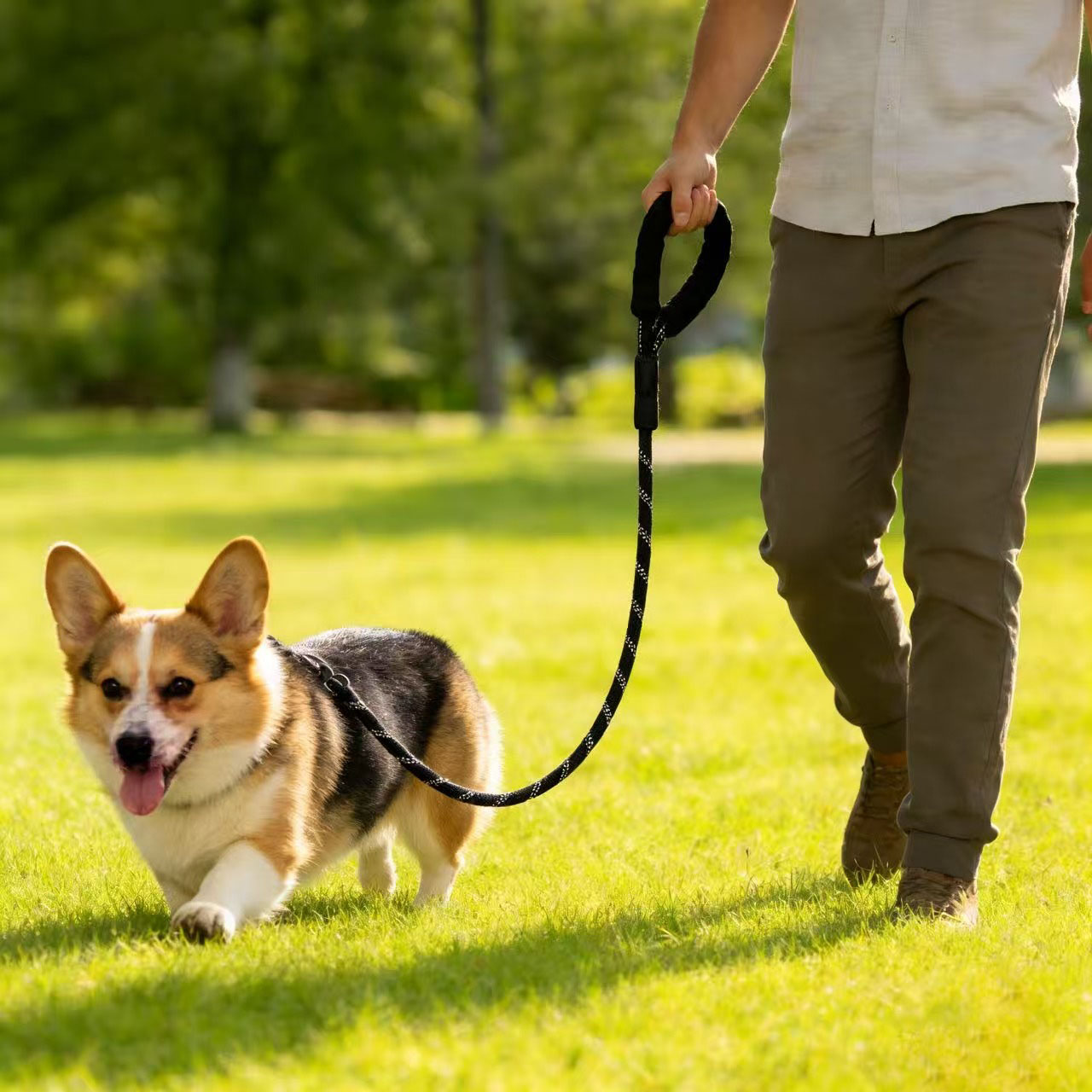 High Visibility Reflective Design:The leash is woven with 360° reflective threads, which reflect light strongly in low-light conditions such as dawn, dusk, and at night. This significantly increases your dog's visibility to passing vehicles and pedestrians, ensuring safer walks for both you and your pet.