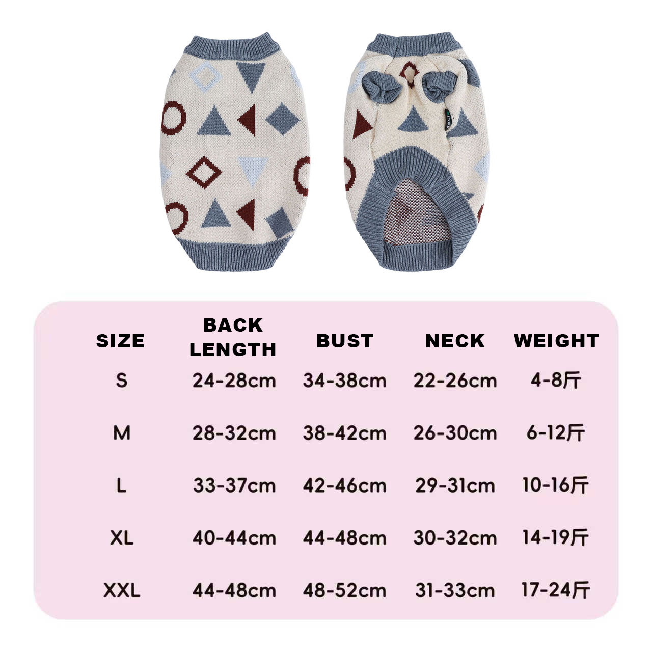 Size:Available in s to 2XL, this sweater fits popular small/medium breeds like Teddy, Bichon Frise, Corgi, and British Shorthair cats.Please refer to the size chart to measure your pet’s chest and back length for the best fit.The stretchy fabric also works for slightly chubby pets.